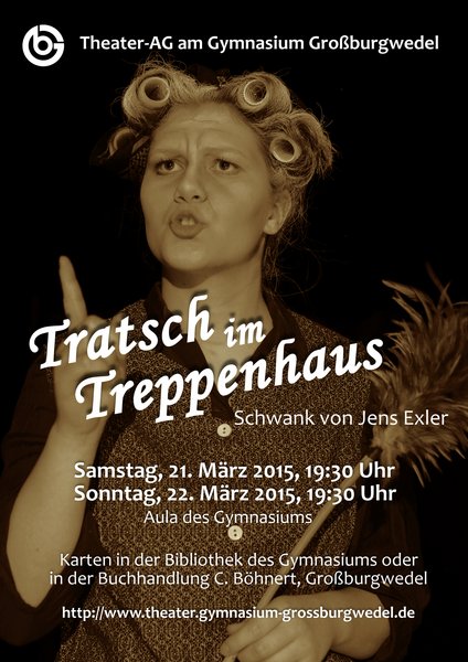 2015: Tratsch im Treppenhaus Tratsch im Treppenhaus Schwank von Jens ExlerVorstellungen am 21. und 22. März 2015 Personen und ihre Darstellerinnen und Darsteller Ewald Brummer Lukas Feld Hanne Knoop Clara Esser Meta Boldt Johanna Böttcher Dieter Brummer Lennart Prüßmann Heike Seefeldt Malin Metten Bernhard Tramsen Gunnar Prüßmann Herr Seefeldt Jan Pakulat Lichteinrichtung: Behrend Piering, Lorenz PieringTechnik: Corvin Tatge, Jonas ReimannBühnenbildentwurf: Lorenz Piering, Yannik SülzleKostüm, Maske: Sabine GrüneFotos: Johannes GrüneInszenierung: Wolfgang Grüne Programmheft "Tratsch im Treppenhaus"Theater-AG, 201563 MB